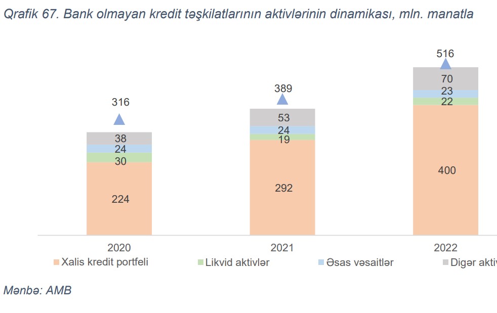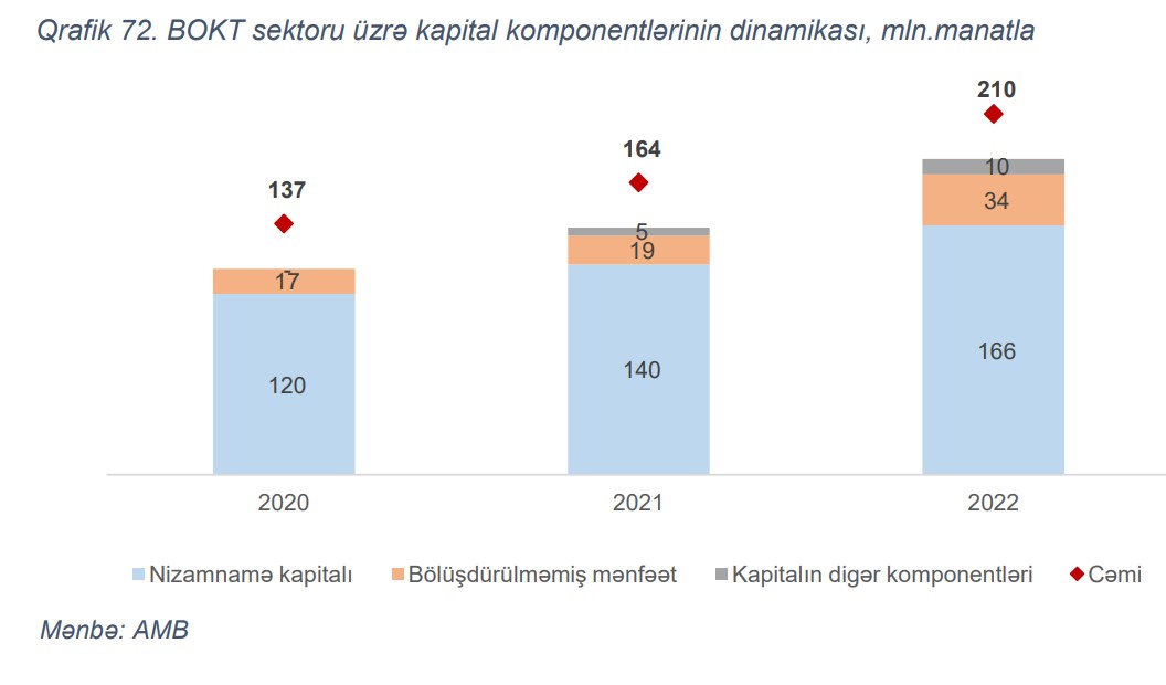 2022-ci il ərzində BOKT sektorunun balansı genişlənmişdir. Ölkədə fəaliyyət göstərən BOKT-lərin cəmi aktivləri il ərzində 33% (127 mln. manat) artaraq 516 mln. manat təşkil etmişdir. Artımın əsas drayveri xalis kredit portfeli olmuşdur. İl ərzində xalis kredit portfeli 37% (108 mln. manat) artmışdır ki, artım əsasən istehlak kreditləri hesabına formalaşmışdır (62 mln.manat).
