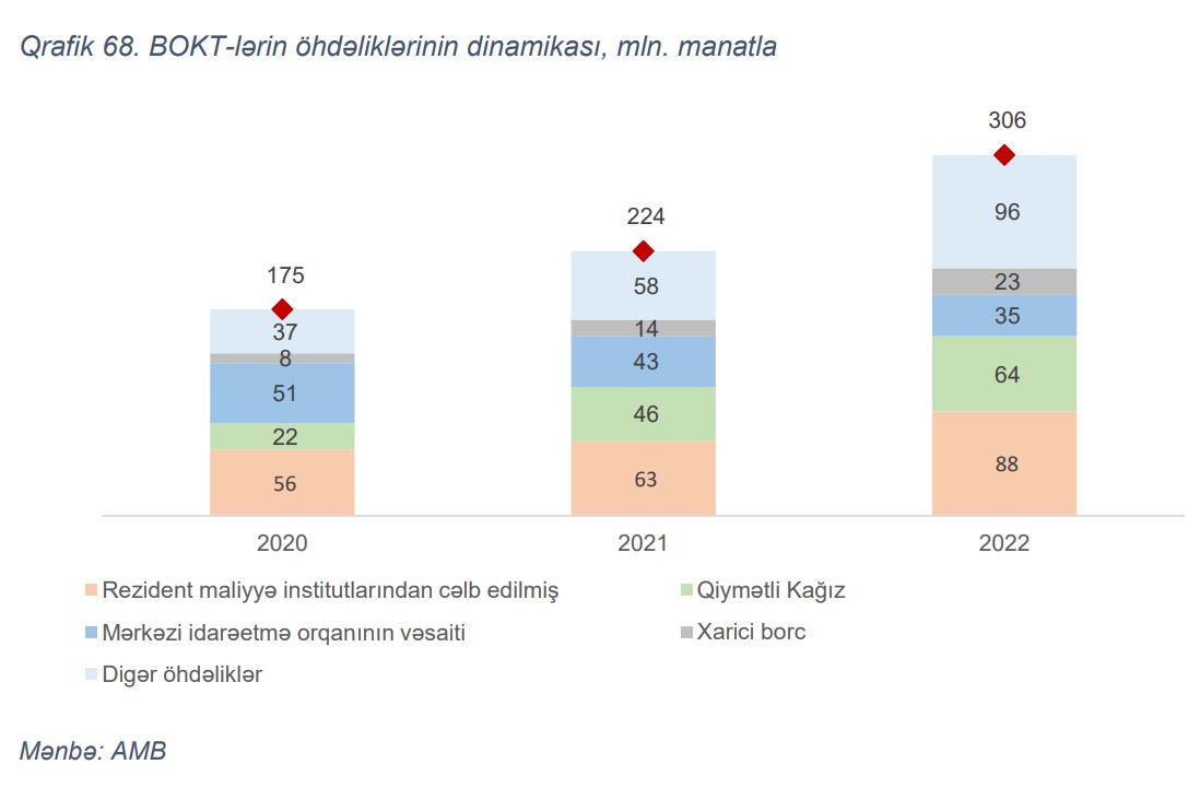 Aktivlərin artımı BOKT-lərin maliyyə sistemi qarşısında öhdəliklərinin artımı hesabına dəstəklənmişdir. BOKT-lərin cəmi öhdəlikləri il ərzində 37% (82 mln. manat) artaraq 306 mln. manat təşkil etmişdir ki, artım əsasən bank və digər maliyyə institutlarının kreditləri (35 mln. manat), habelə qiymətli kağızlar (18 mln. manat) hesabına formalaşmışdır.