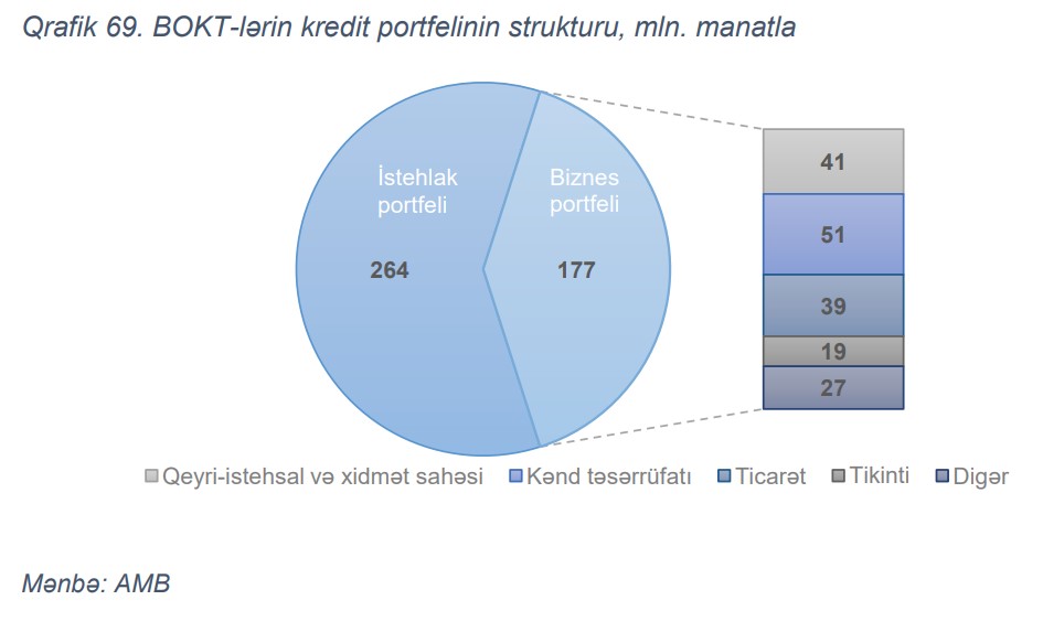 2022-ci ildə də istehlak kreditləri BOKT-lərin portfelində əsas yeri tutmaqda davam etmişdir. İl ərzində kredit portfeli 32% (107 mln. manat) artaraq 440 mln. manat olmuşdur. İstehlak kreditləri üzrə illik artım 31%, biznes portfeli üzrə isə 34% olmuşdur. 2022-ci ilin sonuna BOKT-lərin kredit portfelinin 60%-i (264 mln. manat) istehlak kreditləri, 40%-i (176 mln. manat) isə biznes kreditləri təşkil edir. Biznes portfelinin 22%-i (51 mln. manat) kənd təsərrüfatı, 18%-i (41 mln. manat) qeyri-istehsal və xidmət sahələrinin, 17%-i (39 mln. manat) isə ticarət sahəsinə verilmiş kreditlər təşkil edir.