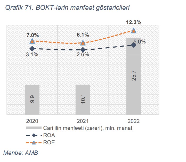 Sektor mənfəət generasiya etməyə davam edir. 2022-ci ildə BOKT-lər son 5 ilin ən yüksək mənfəətliliyini əldə etmişdir ki, bu da ötən ilin mənfəətindən 2.5 dəfə çoxdur. Sektorun mənfəətliliyinin artmasında kredit portfelinin böyüməsi ilə artan faiz gəlirlərindən əlavə kredit təşkilatlarının əməliyyat səmərəliyinin də artması əsas drayverlərdən olmuşdur. Sektorun ROA və ROE göstəriciləri də keçən il ilə müqayisədə 2 dəfə artaraq müvafiq olaraq 5% və 12.3% olmuşdur. Sektorun kapital mövqeyində müsbət tendensiya müşahidə edilməkdədir. İl ərzində BOKT-lərin kapitalı 28% (46 mln. manat) artaraq 210 milyon manat təşkil etmişdir. Kapitalın artımı həm kapital inyeksiyası, həm də BOKT sektorunun mənfəət generasiyası hesabına olmuşdur.