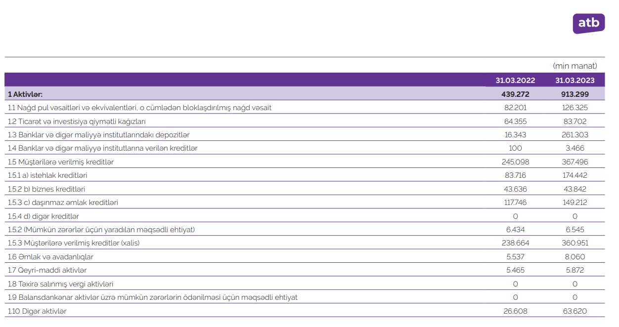 Dövlət bankı Azər Türk Bankın 01 aprel 2023-cü il tarixinə aktivləri ötən ilin müvafiq dövrü ilə müqayisədə 100%-dən çox artaraq, 913,3 milyon manat səviyyəsində olmuşdur.