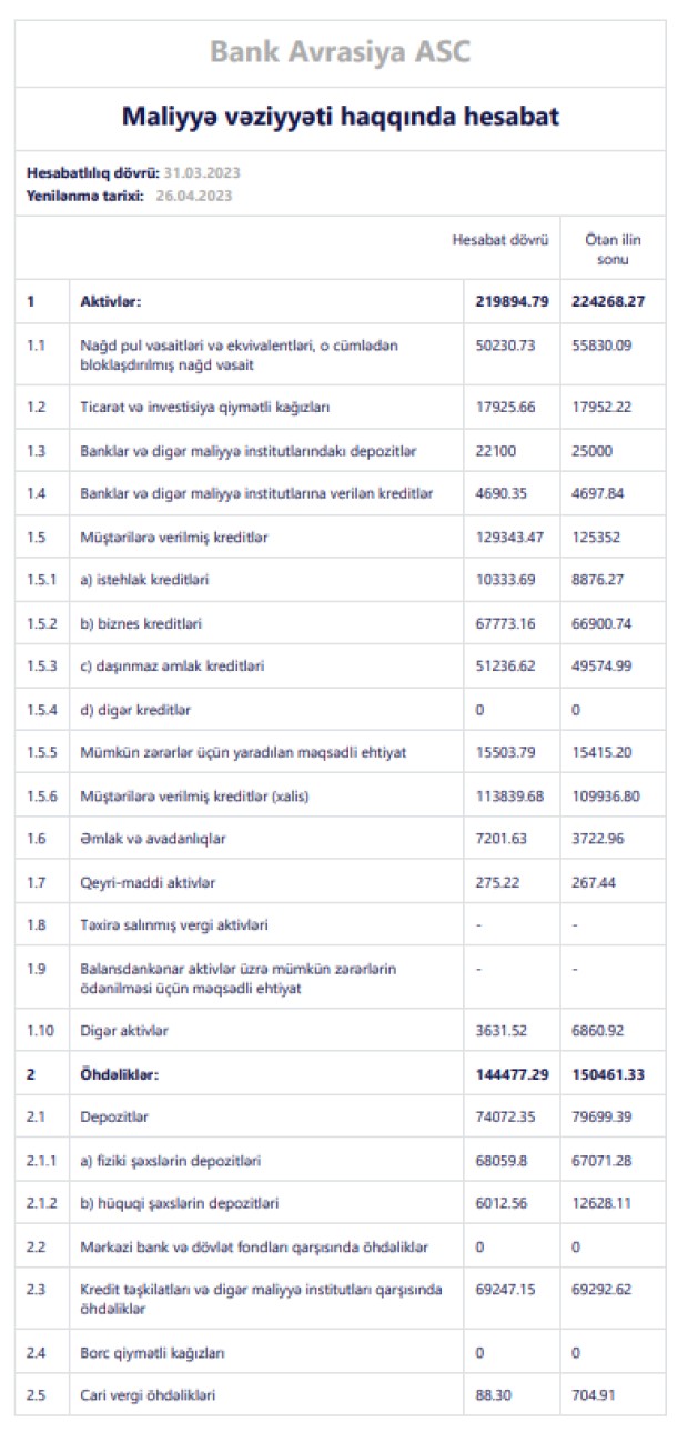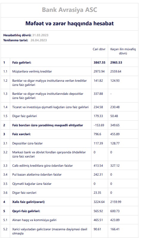 "Bank Avrasiya" ASC 2023-cü ilin ilk rübünü (yanvar-mart) 1 milyon 555 min manat xalis mənfəət ilə başa vurub. Bank ötən ilin eyni dövrünü 763 min manat xalis mənfəət ilə bağlamışdı. Beləliklə, "Bank Avrasiya"nın xalis mənfəəti 2023-ci ilin 1-ci rübündə 2022-ci ilin 1-ci rübü ilə müqayisədə 2 dəfədən çox artıb. Bankın xalis mənfəətin artması faiz gəlirlərin artmasından və faiz borcları üzrə yaradılmış məqsədli ehtiyatlara vəsait ayırmamasından qaynaqlanır.
