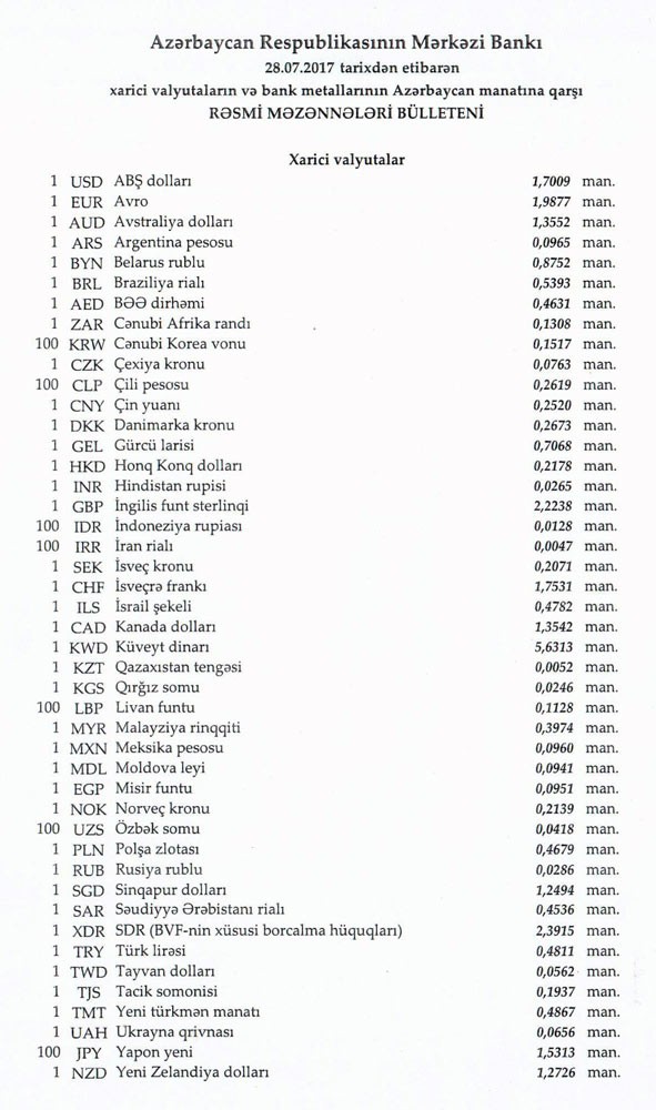 İyulun 28-nə Mərkəzi Bankın açıqladığı rəsmi Dollar/manat məzənnəsi İyulun 27-si ilə müqayisədə düşərək 1,7009 manat olub, Avro/manat məzənnəsi isə 1.9877 manata düşüb .