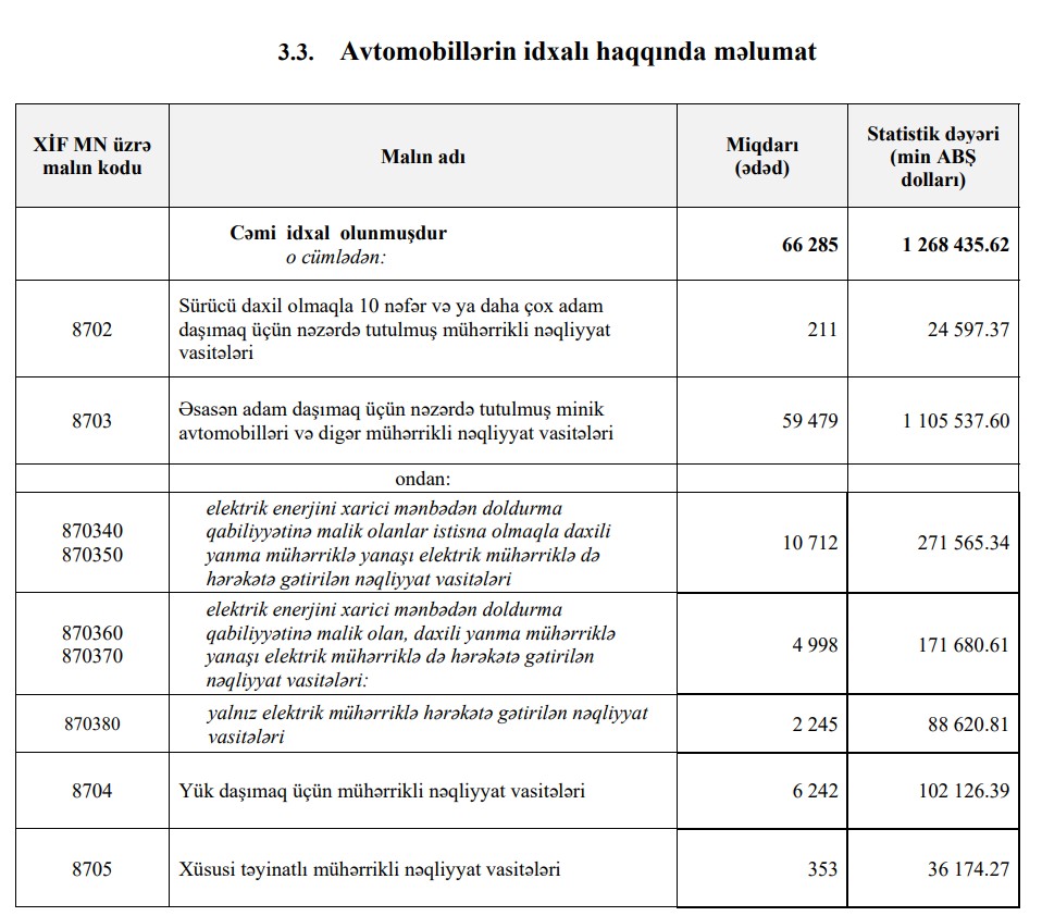 2025-ci ilin 9 ayı ərzində (yanvar-sentyabr) Azərbaycana 1 milyard 605 milyon 21 min dollar dəyərində 85 min 257 ədəd nəqliyyat vasitəsi (avtomobil) idxal olunub.
