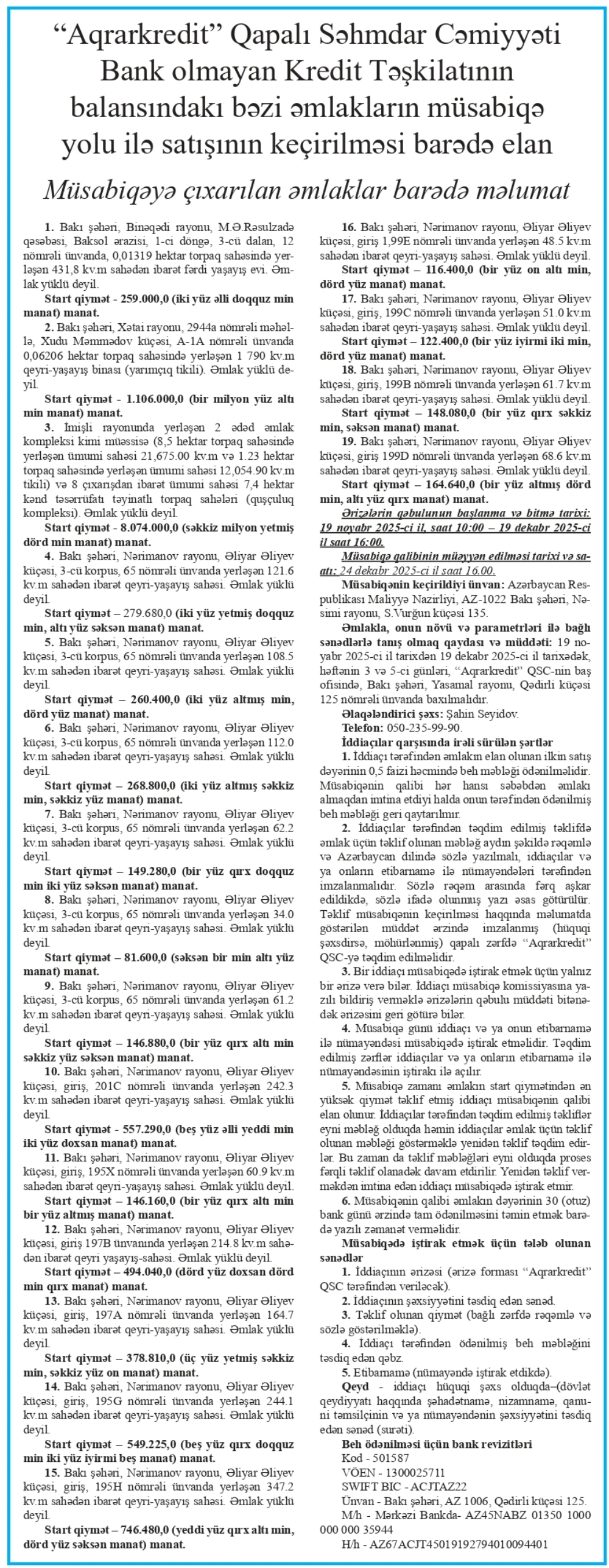 “Aqrarkredit” Qapalı Səhmdar Cəmiyyəti Bank olmayan Kredit Təşkilatının balansındakı bəzi əmlakların müsabiqə yolu ilə satır.