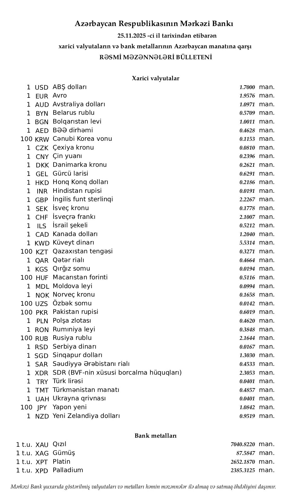 Rəsmi məzənnələr açıqlandı