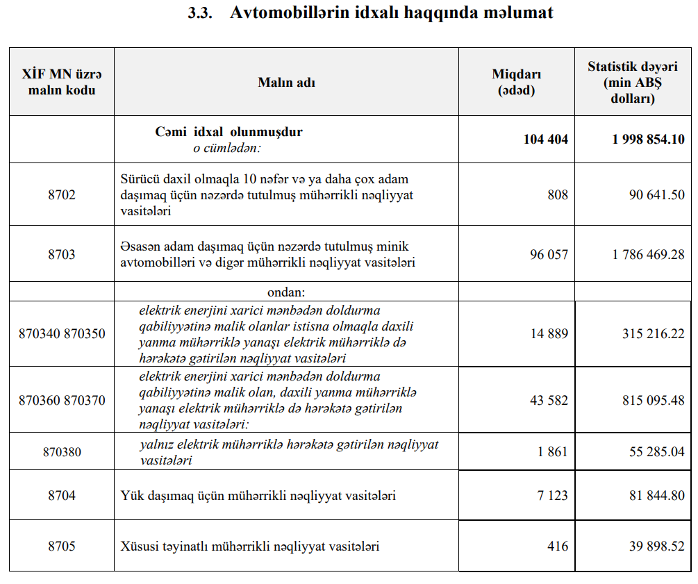 2025-ci ilin 11 ayı ərzində Azərbaycana 1 milyard 786 milyon 469 min dollar dəyərində 96 min 57 ədəd minik avtomobili, o cümlədən, 43 min 582 ədəd hibrid və 14 min 889 ədəd tam elektrik avtomobil idxal olunub. Müqayisə üçün qeyd edək ki, ötən ilin eyni dövründə 1 milyard 417 milyon 981 min dollar dəyərində 74 min 366 ədəd minik avtomobili, o cümlədən 8 min 478 ədəd hibrid və 14 min 176 ədəd tam elektrik avtomobil idxal olunmuşdu.