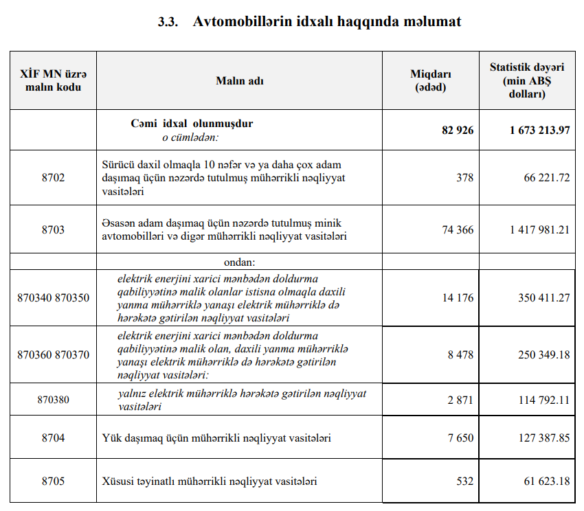 Müqayisə üçün qeyd edək ki, 2024-cü ilin 11 ayı (yanvar-noyabr) ərzində Azərbaycana 1 milyard 673 milyon 214 min dollar dəyərində 82 min 926 ədəd avtomobil idxal edilmişdi.