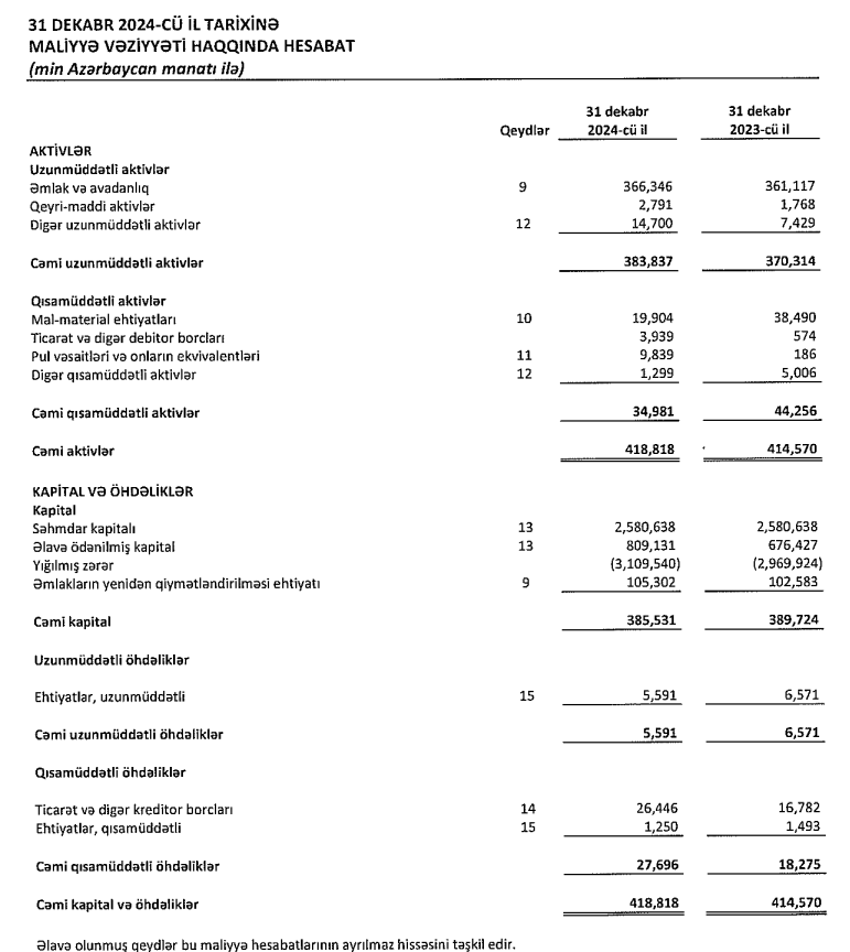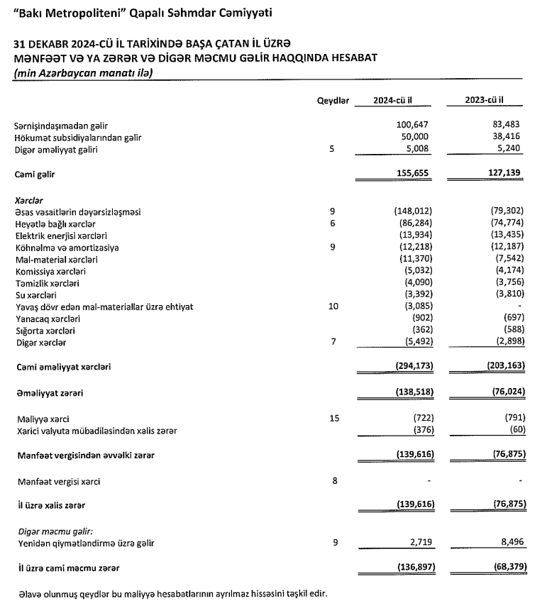 Bu barədə Marja.az "Bakı Metropoliteni" QSC-nin 31 dekabr 2024-cü il tarixində başa çatan il üzrə Maliyyə Hesabatları və Müstəqil Auditor Hesabatına istinadən xəbər verir.