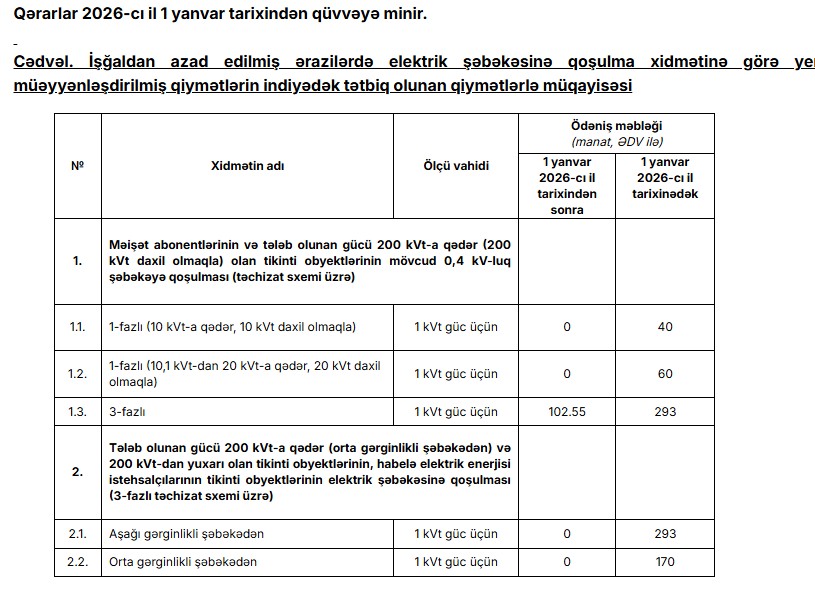 Məişət abonentlərinin, həmçinin istehlak gücü 20 kVt-a qədər olan qeyri-yaşayış obyektlərinin mövcud 0,4 kV-luq elektrik şəbəkəsinə 1 fazlı sxem üzrə qoşulması ödənişsiz olacaq.
