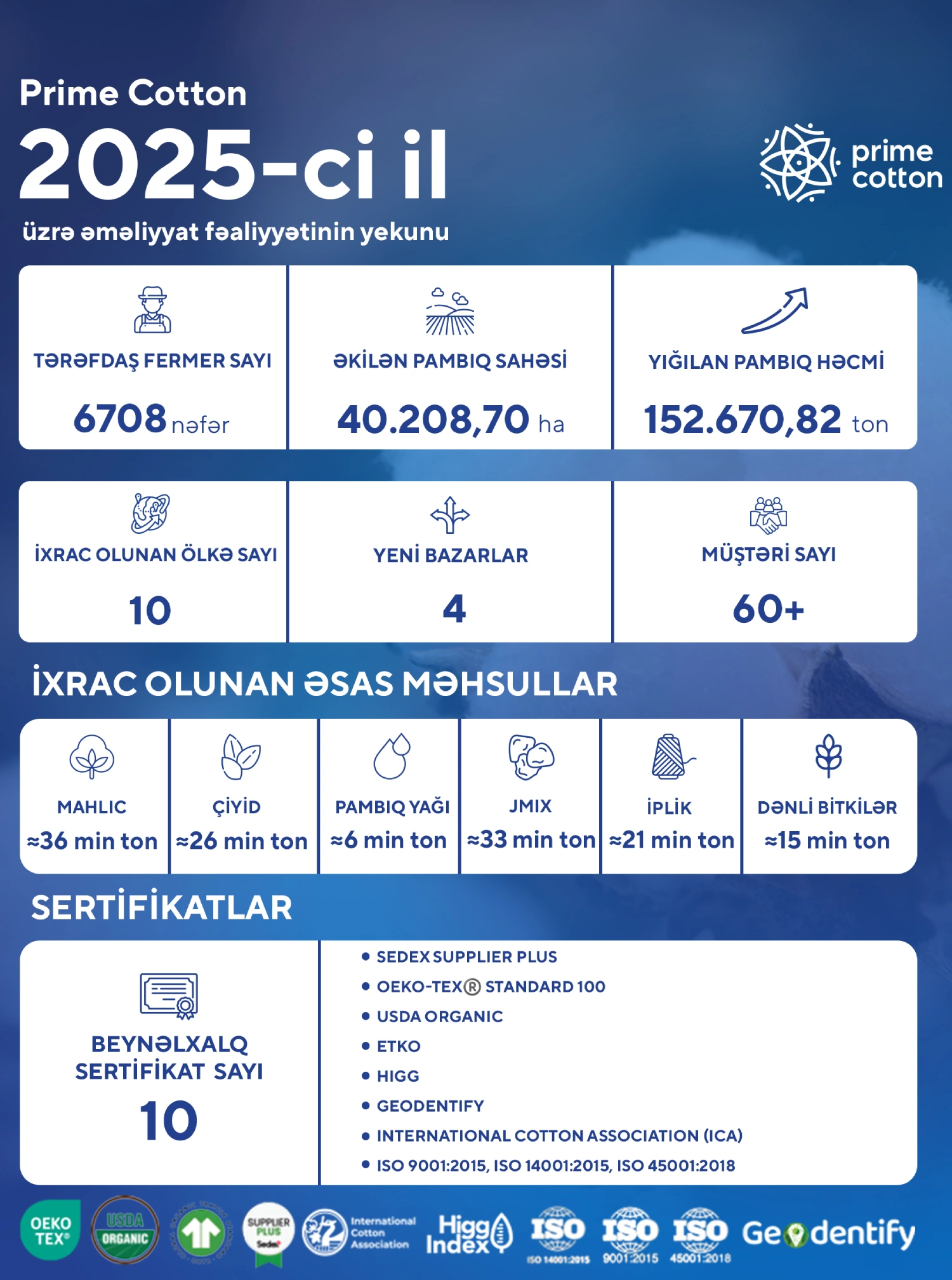 2025-ci il eyni zamanda Prime Cotton-un beynəlxalq etimad və sertifikatlaşma baxımından mühüm nailiyyətlər əldə etdiyi il olub. Şirkət OEKO-TEX® Standard 100, USDA Organic, Sedex Supplier Plus, HIGG, ETKO, Geodentify, International Cotton Association (ICA) üzvlüyü, eləcə də ISO 9001:2015, ISO 14001:2015 və ISO 45001:2018 sertifikatları daxil olmaqla 10 beynəlxalq sertifikata sahib olaraq fəaliyyətini qlobal standartlara uyğun şəkildə qurduğunu təsdiqləyib.