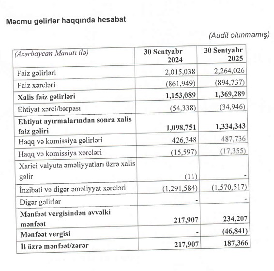 "Merkuri Bank Olmayan Kredit Təşkilatı" ASC ("Merkuri BOKT") 2025-ci ilin 9 ayını (yanvar-sentyabr) 171 min manat mənfəət ilə başa vurub. Halbuki, kredit təşkilatı 2024-cü ilin 9 ayını 212 min manat mənfəət ilə bağlamışdı (xalis mənfəəti 19,3% azalıb).