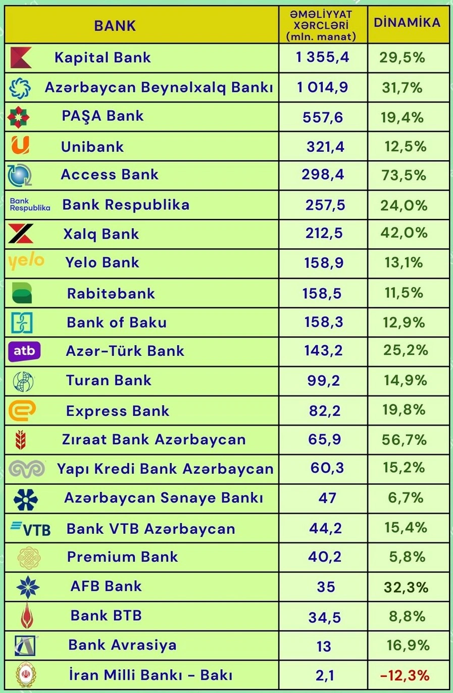 Qalan 21 bankın əməliyyat xərcləri artıb. Ən yüksək dinamika “Access Bank”da (73,5%), ən aşağı dinamika isə “Premium Bank”da (5,8%) qeydə alınıb.