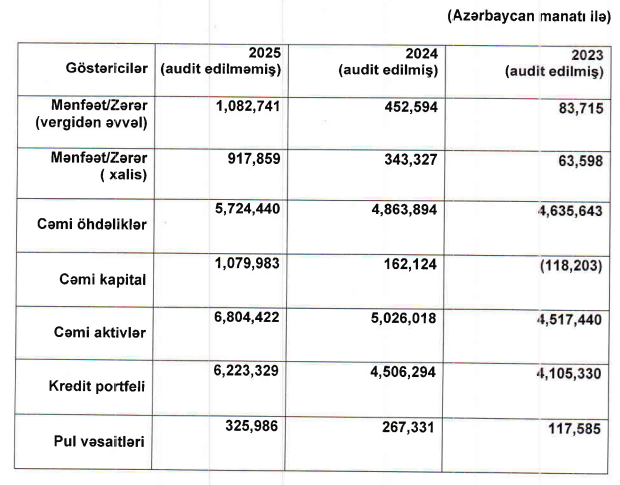2025-ci ilin sonunda cəmi aktivləri 6 milyon 804 min manat, o cümlədən kredit portfeli 6 milyon 223 min manat olan "BQ" ASC ili 918 min manat xalis mənfəət ilə başa vurub. Şirkətin xalis mənfəəəti 2023-cü ildə 64 min manat, 2024-cü ildə 343 min manat təşkil etmişdi.