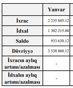 Beləliklə, 2026-cı ilin yanvarında 2025-cı ilin yanvar ayı ilə müqayisədə Azərbaycanın xarici ticarət əməliyyatlarının həcmi 5 milyard 90 milyon dollardan 3 milyard 538 milyon dollara, o cümlədən ixracı 3 milyard 38 milyon dollardan 2 milyard 235 milyon dollara, idxalı isə 2 milyard 52 milyon dollardan 1 milyard 302 milyon dollara düşüb.