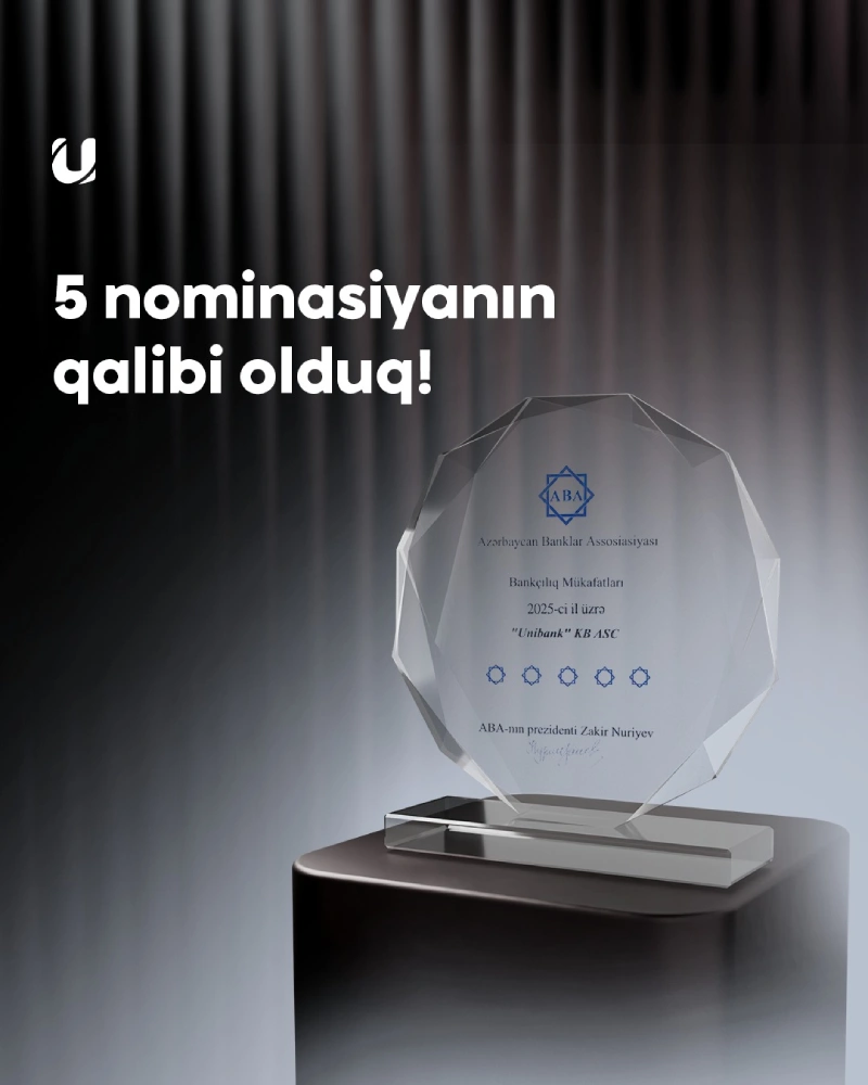 (®) Unibank Azərbaycan Banklar Assosiasiyası (ABA) tərəfindən həyata keçirilən “Bankçılıq Mükafatları - 2025” təşəbbüsü çərçivəsində 5 nominasiya üzrə qalib olub. Qiymətləndirmə bankların müxtəlif sahələr üzrə fəaliyyətlərini əhatə edib.