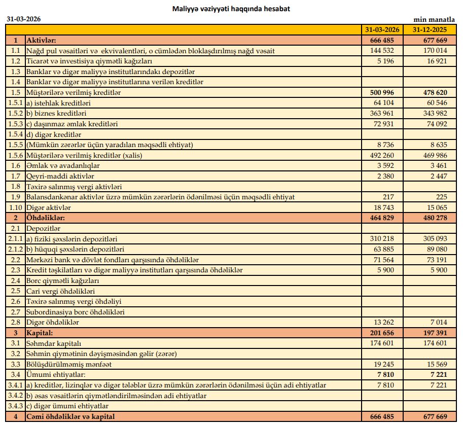 "Premium Bank"ın cəmi aktivləri 2026-cı ilin birinci rübündə 2025-ci ilin sonu ilə müqayisədə 11 milyon 184 min manat və ya 1,7% azalaraq 31 dekabr 2026-cı il tarixində 666 milyon 485 min manat təşkil edib.