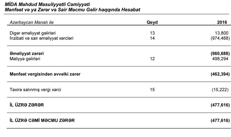 "Marja" MMC-nin saytında dərc olunan audit olunmuş maliyyə hesabatına istinadən xəbər verir ki, ötən il "MIDA"nın gəliri 13 min 800 manat, xərcləri isə 974 min 488 manat təşkil edib. Nəticədə MMC-nin 960 min 688 manat əməliyyat zərəri yaranıb.498 min 294 manat maliyyə gəliri zərəri azaldaraq 462 min 394 manata düşməsinə səbəb olub. Təxirə salınmış vergi xərci daxil "MİDA"nın zərəri 477 min 616 manat təşkil edib.