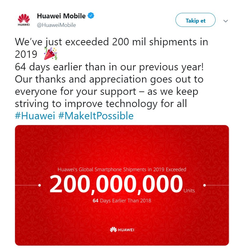 Huawei, bütün 2018-ci il ərzində çatdığı 200 milyon ədəd səviyyəsinə bu il 64 gün tez nail olduğunu qeyd edib.
