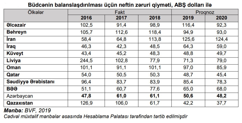 2019-cu il üçün Azərbaycanda neftin dövlət büdcəsində proqnozlaşdırılan qiyməti 60 dollardır.