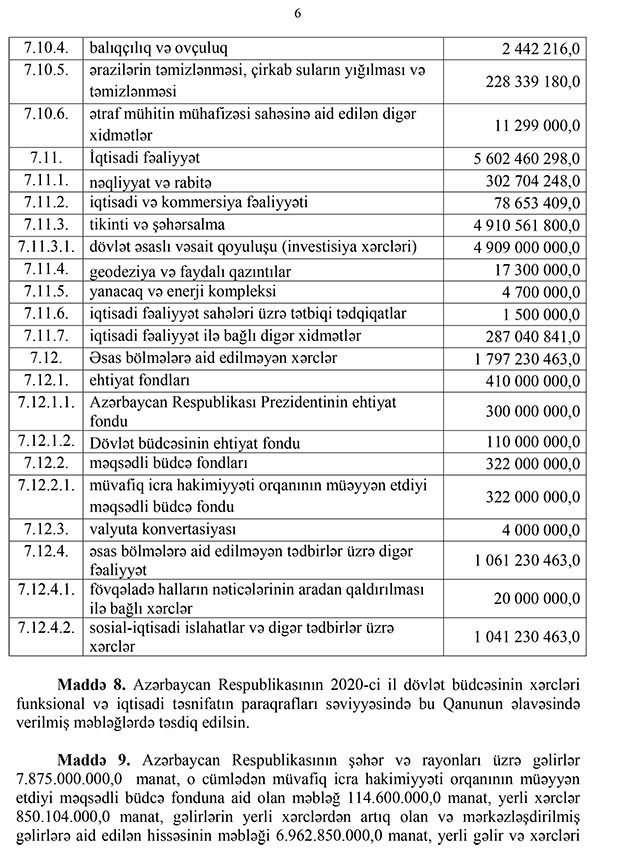 Həmçinin, Azərbaycan Respublikasının 2020-ci il üzrə daxili dövlət borclanmasının yuxarı həddi (limiti) 400 milyon manat, xarici dövlət borclanmasının yuxarı həddi (limiti) 1 milyard manat təsdiq edilib. İl ərzində veriləcək dövlət zəmanətlərinin məbləğinin yuxarı həddi (limiti) də 1 milyard manat məbləğində təsdiq edilib.