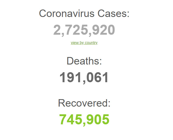 Marja məlumatların yığıldığı "Worldometer" internet saytına istinadən xəbər verir ki, dünyada koronavurusa yoluxduğu aşkarlananların sayı 2 milyon 725 min 920-yə çatıb.