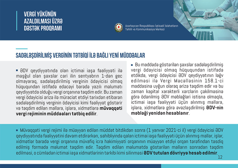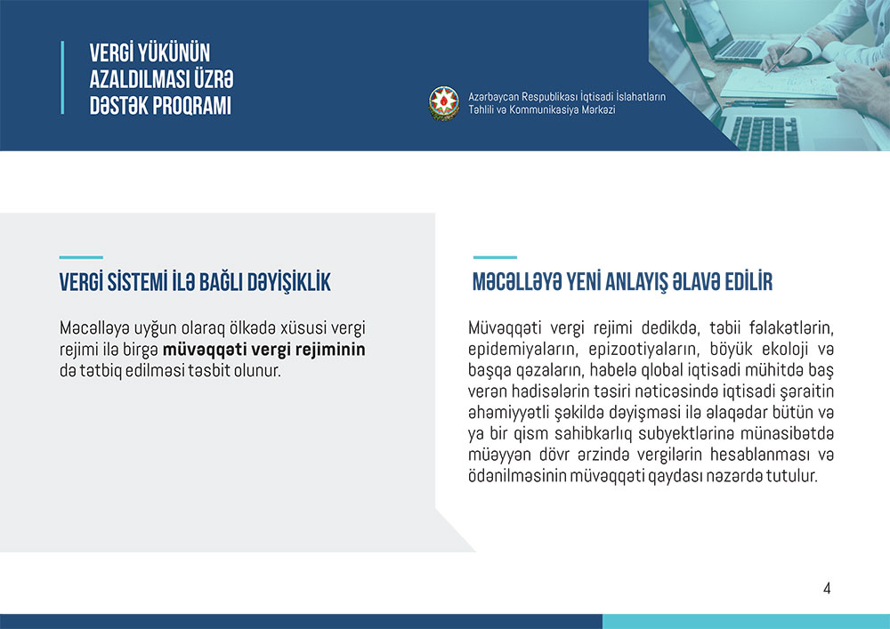 Marja xəbər verir kiI “İslahat icmalı”nda maliyyə yükünün azaldılması, vergi tətilinin verilməsi, tətbiq olunan güzəştlərin əsas təsir dairəsi, eyni zamanda qanunvericiliyə edilmiş digər dəyişiklik və əlavələr müqayisəli formada təqdim olunub.