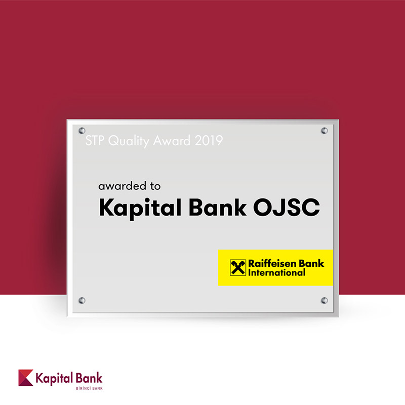 Kapital Bank dünyanın nüfuzlu maliyyə qurumlarından olan Raiffeisen Bank International AG tərəfindən “STP Quality Award 2019” mükafatı ilə təltif edilib. Bu mükafat beynəlxalq ödənişləri yüksək keyifyyətlə icra edən banklara təqdim olunur.