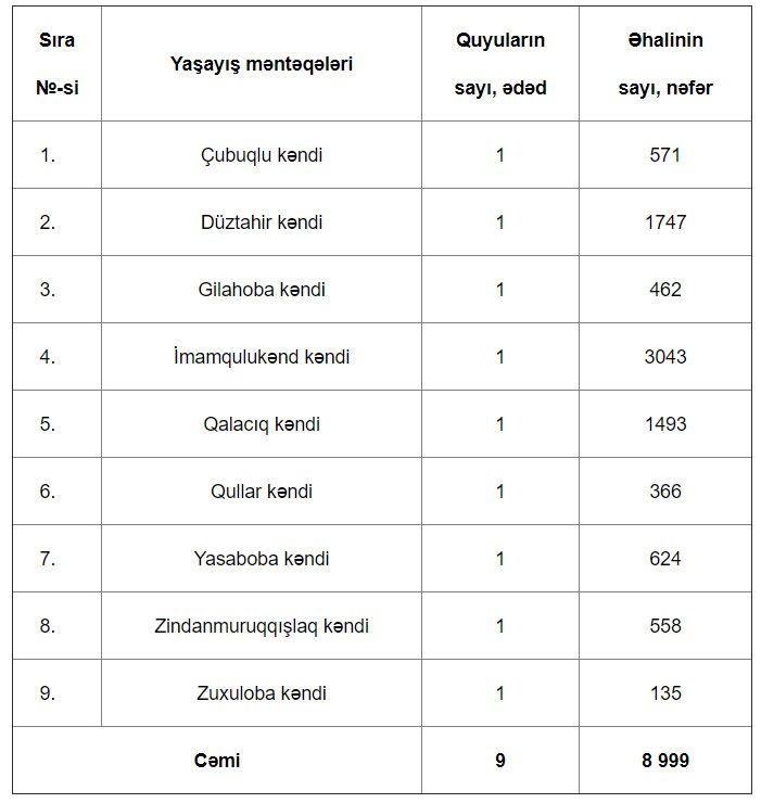 Qusar rayonunda qazılması nəzərdə tutulan subartezian quyularının yaşayış məntəqələri üzrə bölgüsünə dair siyahı