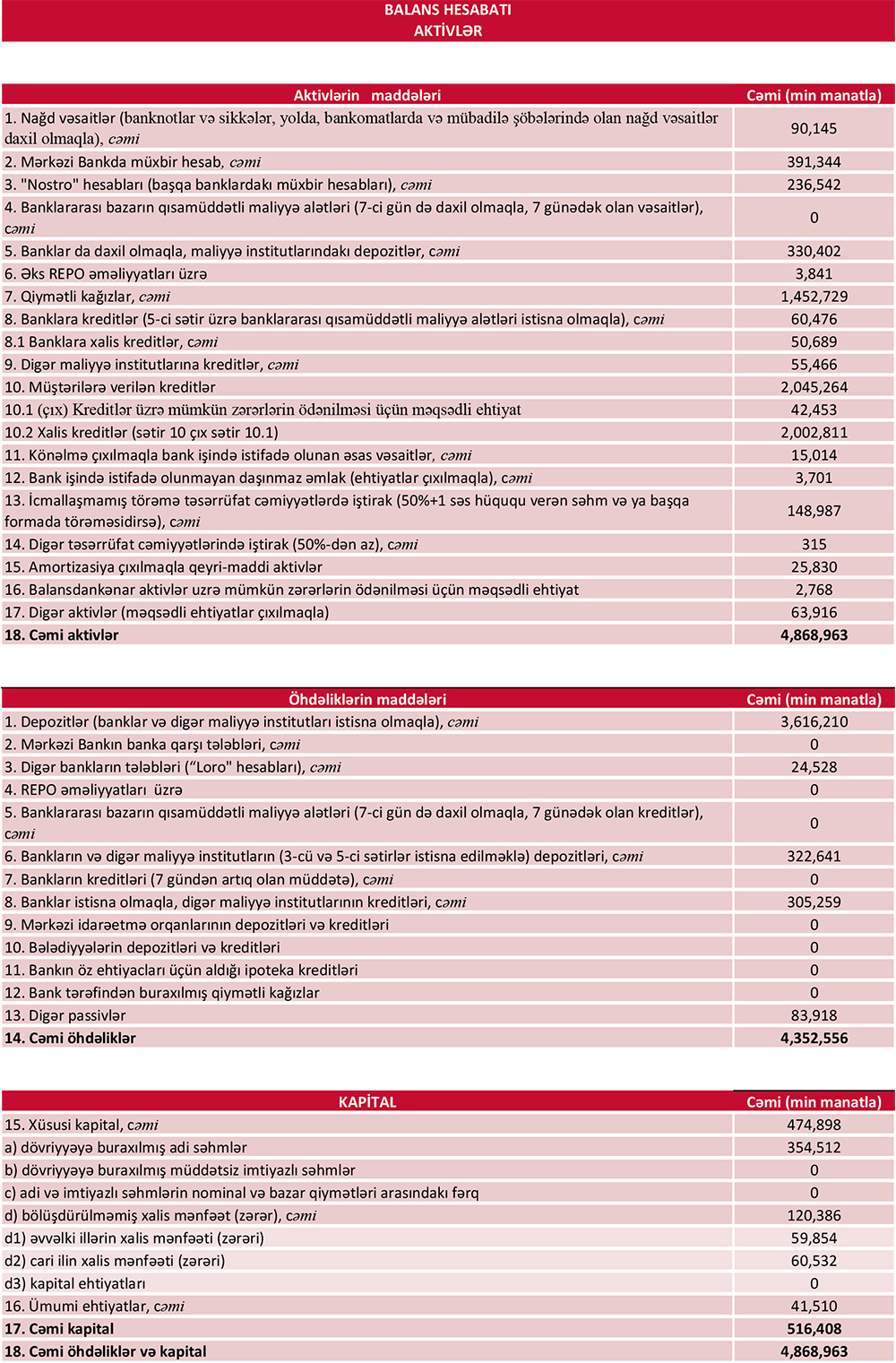 Azərbaycanın iri bankı 60,5 milyon manat xalis mənfəət açıqladı