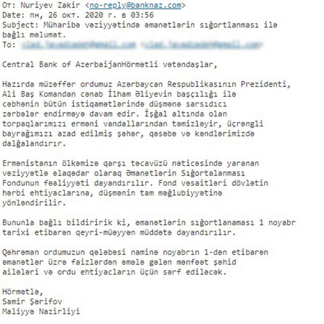 Nəqliyyat, Rabitə və Yüksək Texnologiyalar Nazirliyi yanında Elektron Təhlükəsizlik Xidməti Ermənistan tərəfinin kibermühitdə növbəti uğursuz təxribatını qeydə alıb. Belə ki, vətəndaşlara elektron poçt üzərindən göndərilən saxta məktublarda guya 01 noyabr 2020-ci il tarixindən etibarən Əmanətlərin Sığortalanması Fondunun fəaliyyətinin dayandırılacağı və fond vəsaitlərinin dövlətin hərbi ehtiyaclarına, düşmənin tam məğlubiyyətinə yönləndiriləcəyi qeyd olunur.
