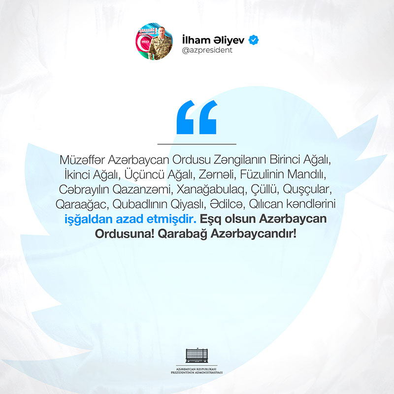 Zəngilanın 4, Füzulinin 1, Cəbrayılın 5, Qubadlının 3 kəndi işğaldan azad edildiMüzəffər Azərbaycan Ordusu Zəngilanın Birinci Ağalı, İkinci Ağalı, Üçüncü Ağalı, Zərnəli, Füzulinin Mandılı, Cəbrayılın Qazanzəmi, Xanağabulaq, Çüllü, Quşçular, Qaraağac, Qubadlının Qiyaslı, Ədilcə, Qılıcan kəndlərini işğaldan azad etmişdir. Eşq olsun Azərbaycan Ordusuna! Qarabağ Azərbaycandır!