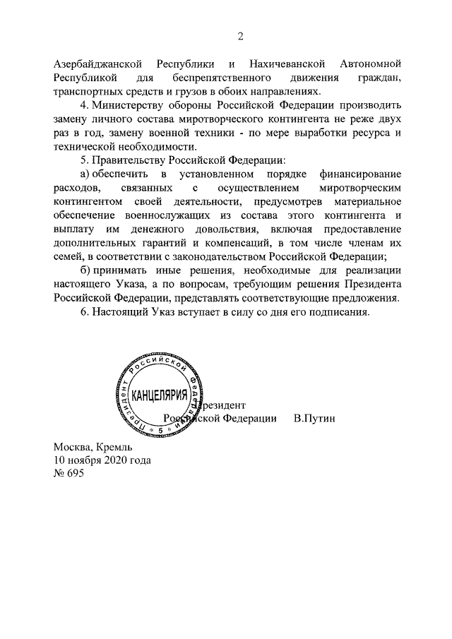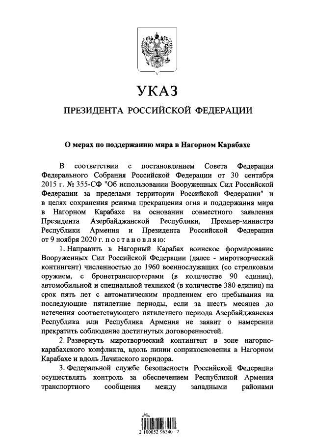 Bu barədə Dağlıq Qarabağda sülhün dəstəklənməsi ilə bağlı tədbirlər haqqında rusiya prezidentinin fərmanında bildirilib.