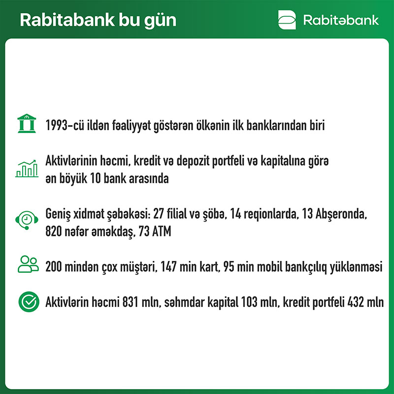 1993-cü ildən hər zaman müştərilərin dəyişən ehtiyaclarına uyğunlaşan, keyfiyyətli xidmət və məhsullar təqdim edən“Rabitəbank” ölkənin 26 bankı sırasında aktivlərin həcmi, kredit və depozit portfeli, həmçinin kapitalına görə ən qabaqcıl 10 bankı sırasında yerini qorumaqdadır. Xidmət və ATM şəbəkəsini genişləndirmiş bank hal-hazırda 27 filial və şöbəsi ilə ölkənin 14 regionunda rahat bankçılıq xidmətləri təqdim edir. 820 nəfərlik böyük kollektivi ilə bank 2021-ci ildə də 200 mindən çox müştərisinə keyfiyyətli və əlçatan maliyyə xidmətlərini təqdim etməyə davam edəcək. Zəfər ilində daha da güclənərək “Rabitəbank” 2021-ci ildə də sahibkarlar ücün etibarlı tərəfdaş, ölkə əhalisi üçün sərfəli və innovativ ödəniş vasitələri və maliyyələşmə həlləri təklif edən ən rahat banklardan biri kimi qalmaga planlaşdırır.