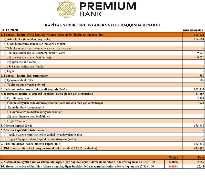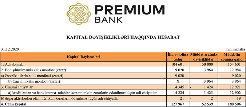 Ötən il “Premium Bank”ın səhmdar kapitalı 50 milyon manat artaraq 154 milyon 601 min manata yüksəlib. Bank 31 Dekabr 2020-ci il tarixində 173 milyon 917 min manat məcmu kapitala malik olub.