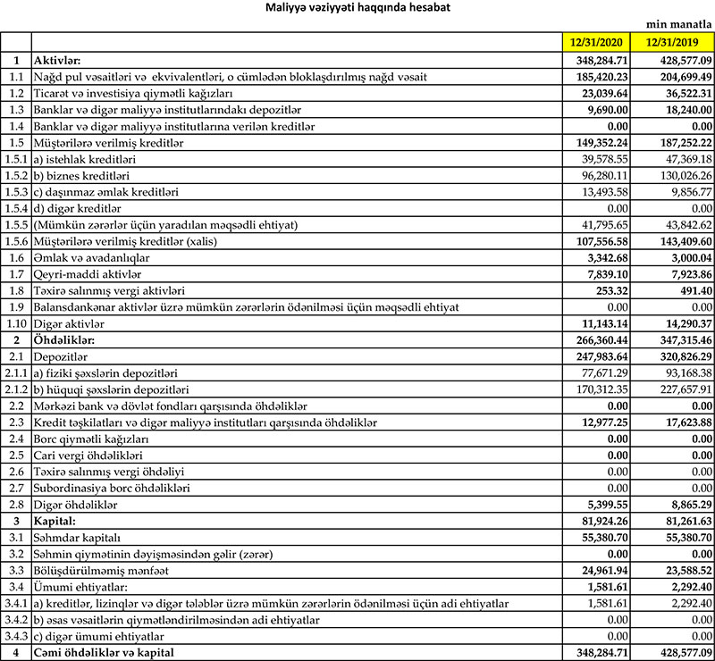 “Yapı Kredi Bank Azərbaycan”da 2019-cu ilin sonunda 320 milyon 826 min manat təşkil etmiş cəmi depozitlər 2020-ci ilin sonunda 247 milyon 983 min manat olub.