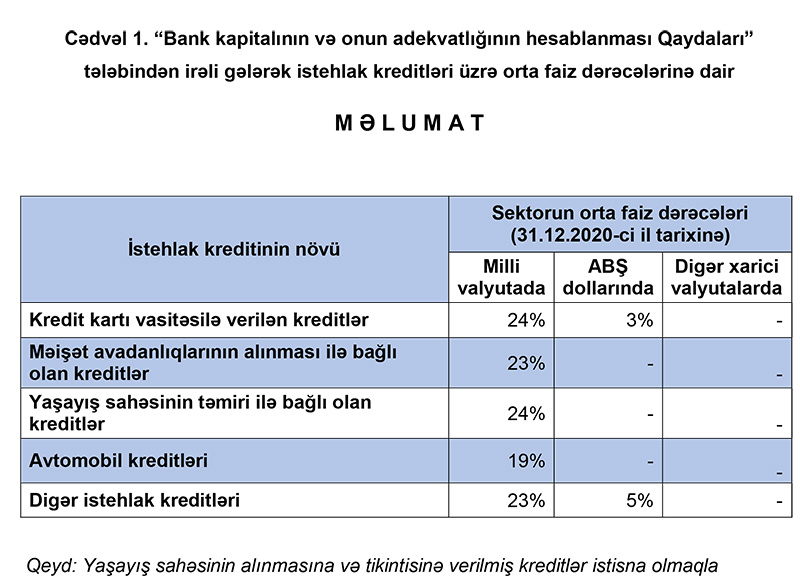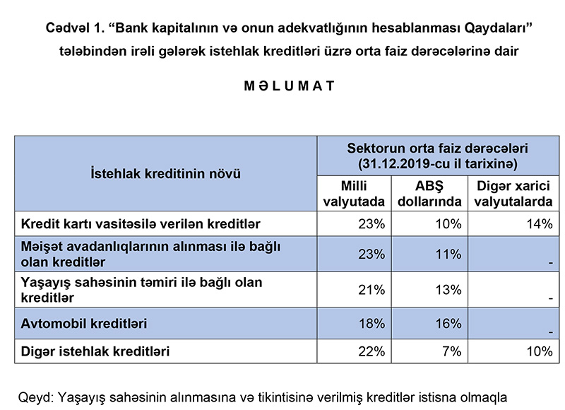 Mərkəzi Bank “Bank kapitalının və onun adekvatlığının hesablanması Qaydaları” tələbindən irəli gələrək istehlak kreditləri üzrə orta faiz dərəcələrinə dair məlumat yayıb.