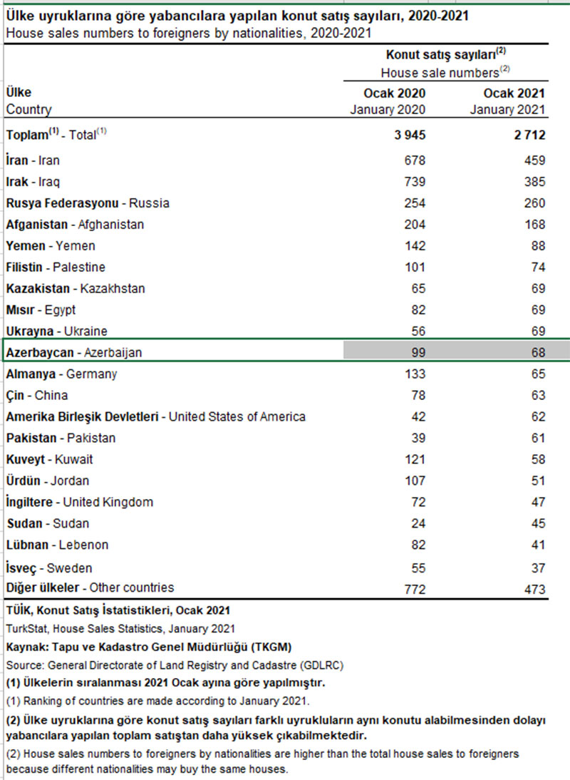“Marja” Türkiyənin Statistika Komitəsinə istinadən xəbər verir ki, 2021-ci ilin yanvar ayında azərbaycanlılar Türkiyədə 68 mənzil alıblar. 2020-cu ilin yanvar ayında azərbaycanlılar Türkiyədə 99 mənzil almışdılar.