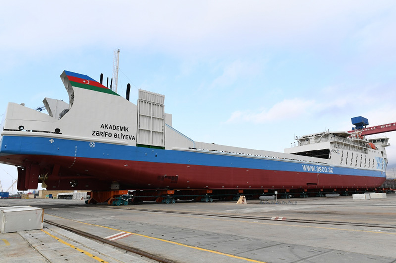 Prezident İlham Əliyev “Akademik Zərifə Əliyeva” gəmi-bərəsinin suya salınmasını bildirən düyməni basıb.