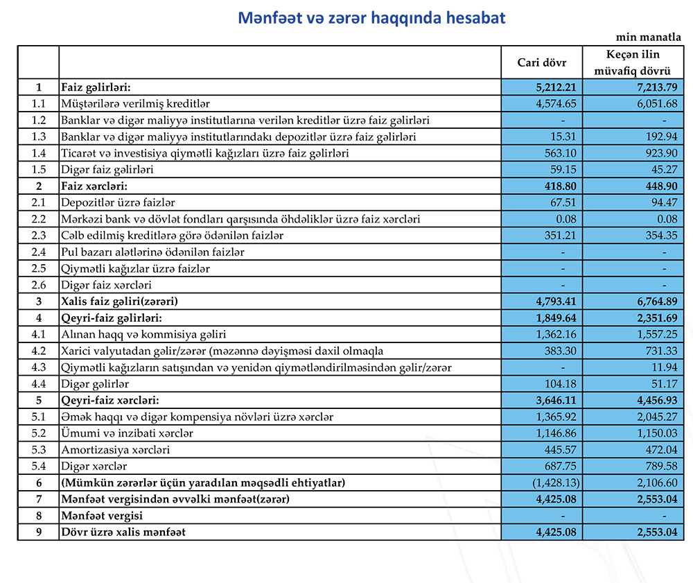 Müqayisə üçün qeyd edək ki, 2020-ci ilin 1-ci rübündə AFB Bankın cəmi əməliyyat gəlirləri 9 milyon 564 min manat, cəmi əməliyyat xərcləri 4 milyon 904 min manat, əməliyyat mənfəəti 4 milyon 660 min manat təşkil etmişdi. Bank əməliyyat mənfəətindən 2 milyon 106 min manat mümkün zərərlər üçün yaradılan məqsədli ehtiyatlara ayırdığından 2 milyon 553 min manat mənfəəti formalaşmışdı.
