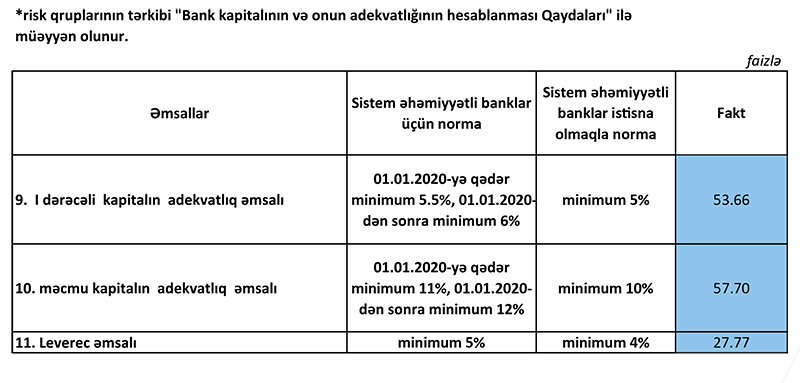 "AFB Bank"ın adekvatlıq əmsalları minimal normalardan dəfələrlə yüksəkdir. Belə ki, 1-ci dərəcəli kapitalın adekvatlıq əmsalı üzrə tələb olunan minimal norma 5% olduğu halda "AFB Bank"da fakt 53.66%, məcmu kapitalın adekvatlıq əmsalı üzrə minimal norma 10% olduğu halda "AFB Bank"da fakt 57.70%-dir. Faktiki normaların minimal tələblərdən yüksək olması "AFB Bank"ın risklərinin çox az olduğuna işarədir.