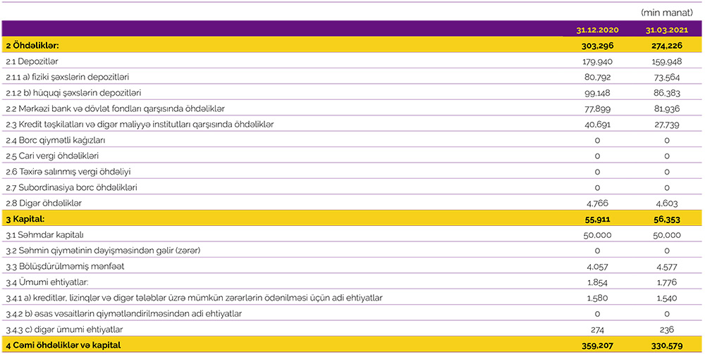 31 Mart 2021-ci il tarixində "Azər-Türk Bank" 50 milyon 207 min manat məcmu kapitala malik olub.