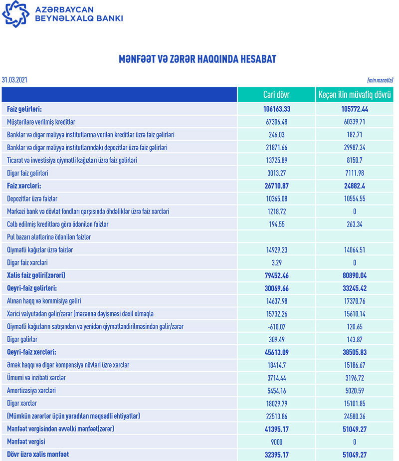 Aktivlərinin həcminə görə ölkəmizin ən böyük bankı olan, dövlətə məxsus “Azərbaycan Beynəlxalq Bankı” ASC 2021-ci ilin 1-ci rübünü (yanvar-mart dövrünü) 41 milyon 395 min manat vergidən əvvəl mənfəətlə başa vurub. Bankın xalis mənfəəti isə 32 milyon 395 min manat olub.