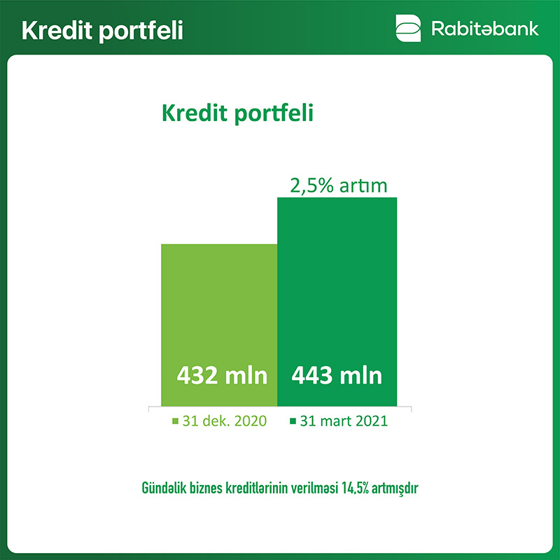 Digər əsas göstərici isə bankın kredit portfelinin artmasıdır ki, hesabat dövründə bankın kredit portfeli 443 milyon manat təşkil edib. Bu da 2020-ci sonuna olan kredit portfeli ilə müqayisədə 2.5% artım deməkdir.