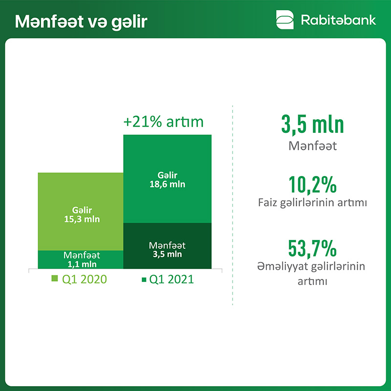 Bank bugünədək olan ən yüksək rüblük gəlir nəticəsinə imza ataraq 2021-ci ilin I rübündə 18.6 milyon manat gəlir əldə edib. 2020-ci ilin anoloji dövrü ilə müqayisədə bankın gəlirləri 21% artıb.