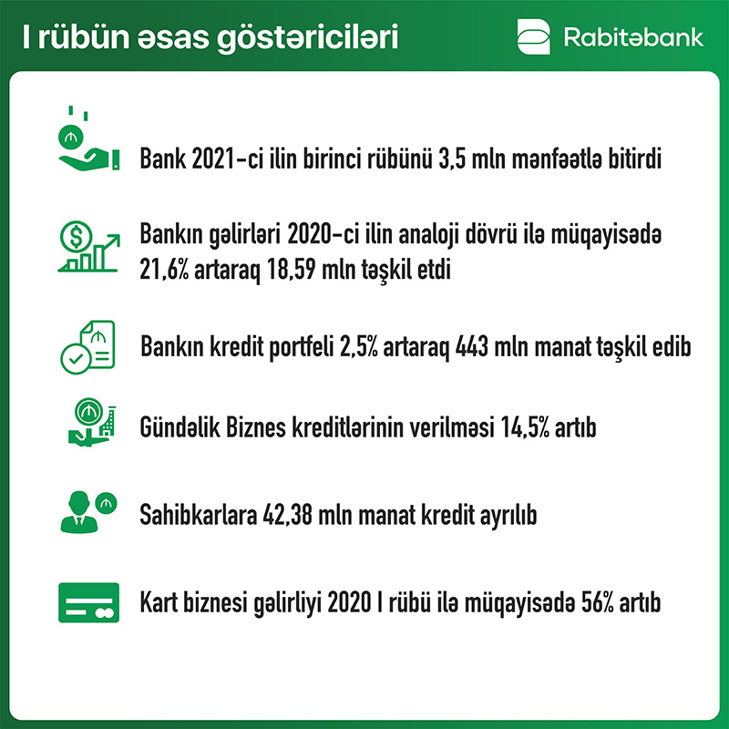 Ölkənin aparıcı banklarından olan “Rabitəbank” 2021-ci ilin ilk rübü üzrə maliyyə göstəricilərini açıqlayıb.