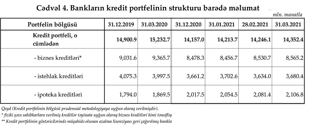Mərkəzi Bank bankların kredit portfelinin strukturu barədə məlumatları açıqlayıb. Məlumatlara görə, 2021-ci ilin Mart ayında kreditlər arasında ən çox artım istehlak kreditlərində qeydə alınıb.