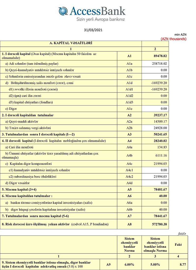 “AccessBank”ın 2021-ci ilin birinci rübündə xalis mənfəəti 135 min manat olub.