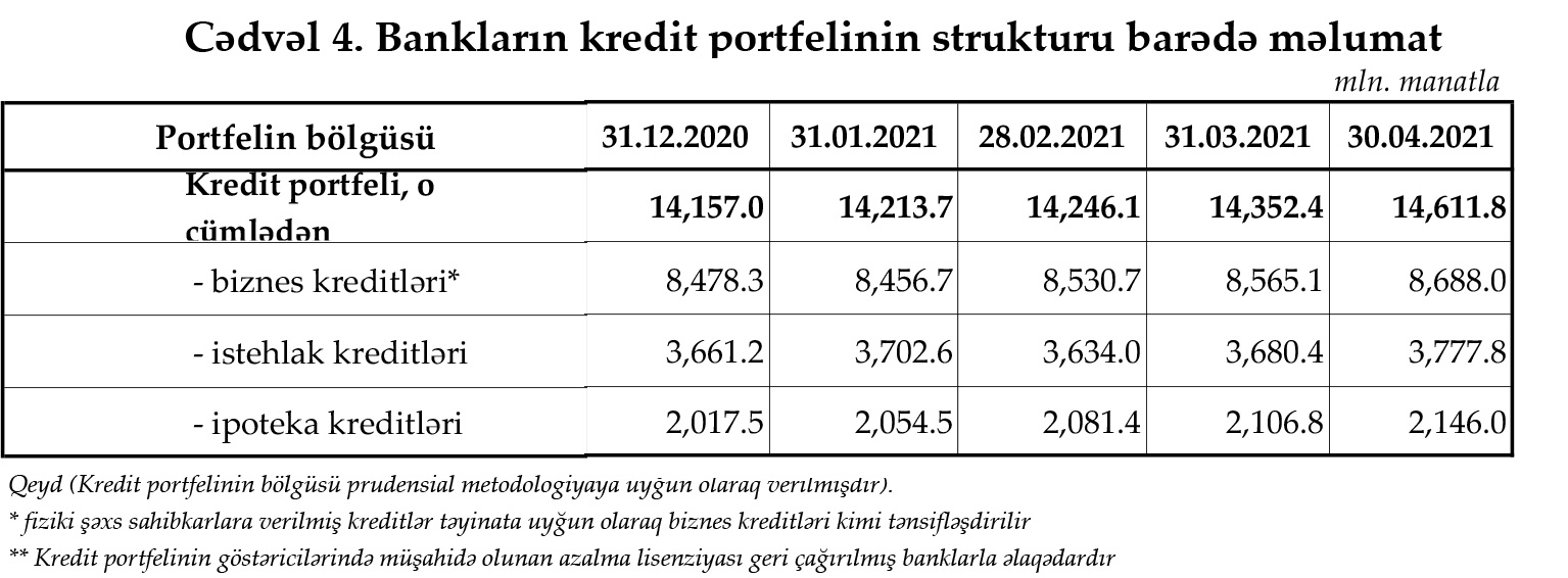 İlk 4 ayda biznes kreditləri 209,7 milyon manat, istehlak kreditləri 116,.6 milyon manat, ipoteka kreditləri isə 128,5 milyon manata artıb.