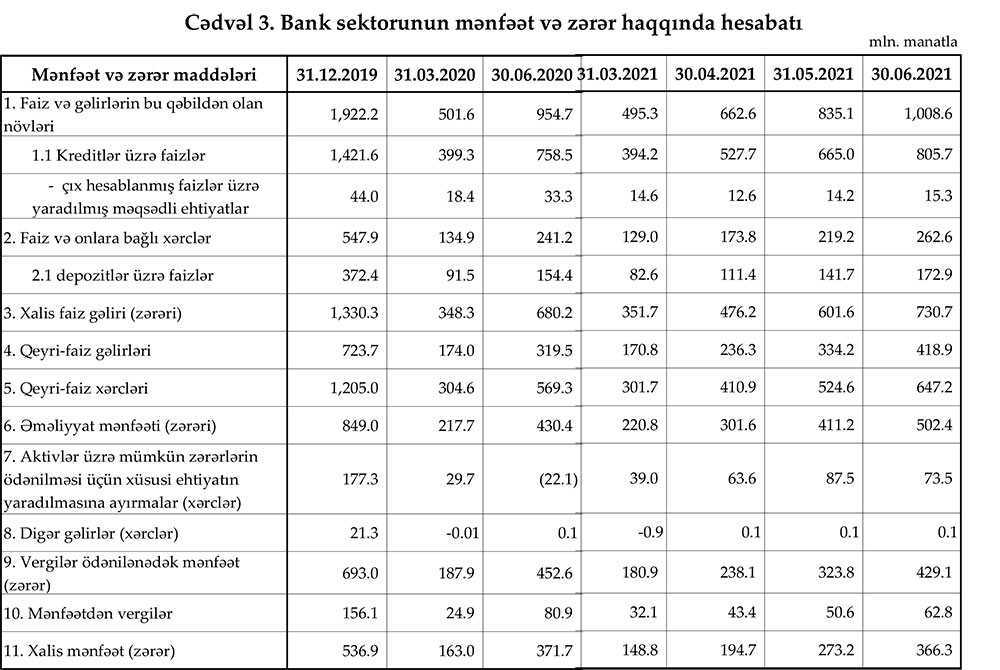 30 iyun 2021-ci il tarixinə olan bank sektorunun əsas göstəriciləri açıqlanıb.